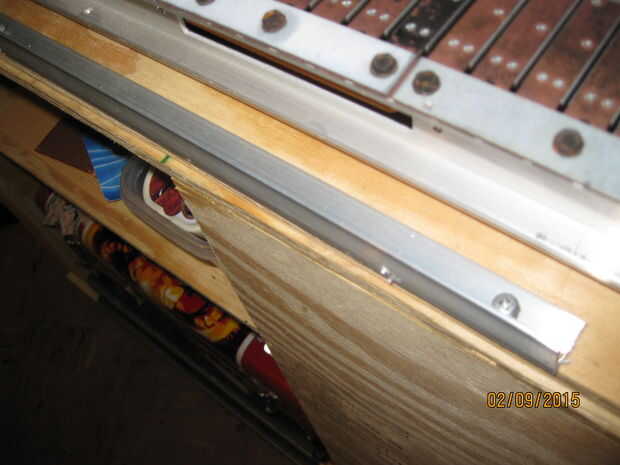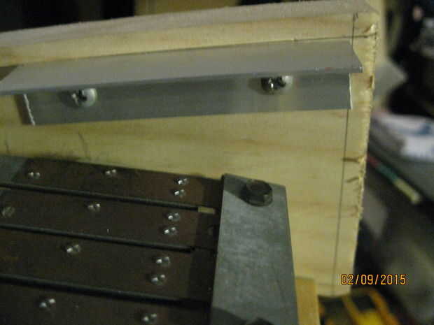 Corte otro pedazo de aluminio de ángulo y había enroscada a lo largo del borde posterior de la base de madera contrachapada. Se trata de un soporte para asegurar la parte posterior de la cubierta de PVC en la base. Voy a añadir unos pocos toques y recortar pedazos más adelante, pero ahora es el momento para instalar la electrónica.
