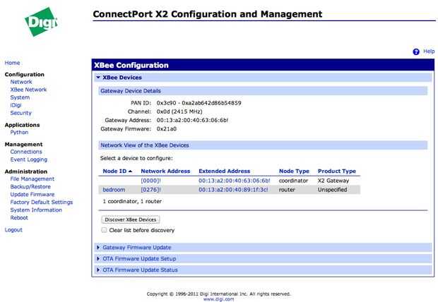 - En su navegador, verá la primera pantalla. Haga clic en red de XBee a la izquierda. Haga clic en el botón "Dispositivos XBee Discover"