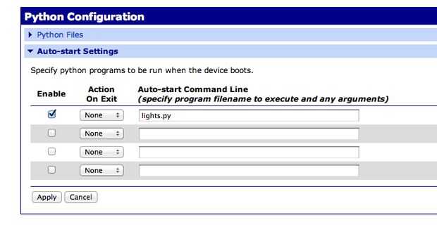 Escriba lights.py en la línea de comandos de inicio automático, luego haga clic en la casilla de habilitar a la izquierda.