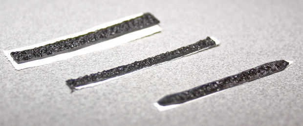 Aquí corté el trabajo sección [arriba] en la mitad longitudinalmente, haciendo dos 3 mm x 40 mm (0.1 en x 1.6 en) almohadillas [media]. Luego cortar todas las esquinas con una caja cortador cuchillo [abajo] para que los bordes de sharpe no meter mis dedos cuando las almohadillas están conectadas al teléfono.