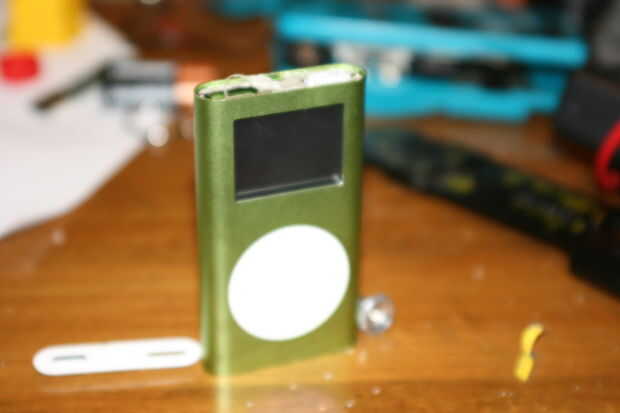 bueno, creo que pone en cortocircuito la batería de mi iPod mini. Así que decidí tomarlo aparte, quite la batería y ver qué se podía hacer. Luego rompió un cable de cinta. Gritos.5 minutos más tarde, mi mini se había convertido en una hucha. =]Si pla