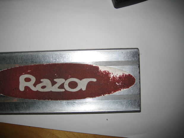 Arcilla encontró una navaja de afeitar en la calle al mismo tiempo que me estaba haciendo esto. Maquinillas de afeitar son scooters para niños con un salto atrás que es una pieza de metal con un resorte Unido. El ciclista empuja hacia abajo en la rueda trasera para aumentar la fricción. Solía Sierra de cinta de ingletes corte la parte inferior de la moto en dos, recuperación de la parte trasera con la rotura para el pedal.