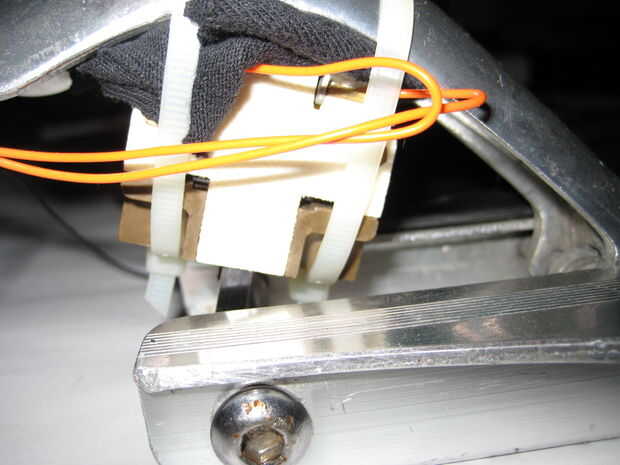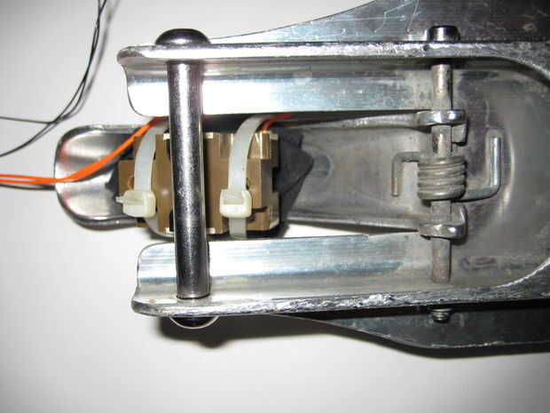 Quité la rueda. He intentado poner los separadores +-cojinetes y usando un switch con un brazo de palanca para reducir el desgaste del interruptor (el uno más difícil presiona más rollos). Al final, la carcacha de un interruptor encontré encaja bien la pieza de descanso. Hay espacio aún para añadir una palanca. O un resorte.