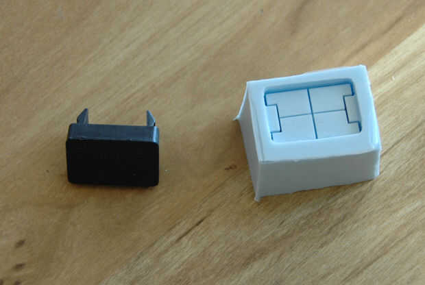 Tenía repuestos tapas "en blanco" en mi cuidado como tuve un modelo base, por lo que opté por usar estos. Podría haber perforado directamente, pero decidido realmente lanzar mi propia como se puede ver. No necesita hacer esto, pero sólo mostrando que hay son un montón de opciones. Puedes ver mi molde en azul.