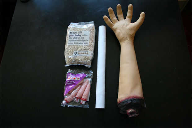 He conseguido superar todo mi brazo falso barato en un supermercado aquí en Irlanda del norte. Vendían por nada, pero reconozco que he pagado el precio completo por los dedos falsos, estuve tentado, y fueron vendidas más adelante esa semana. £ 1 ($1,60) un paquete no exactamente van a romper el Banco. La cebada perlada fue elegida porque es sólida, no escamosa o polvorientos, adecuadamente dimensionado y cuesta solamente 42p por 500g, lo que es muy barato para el relleno.