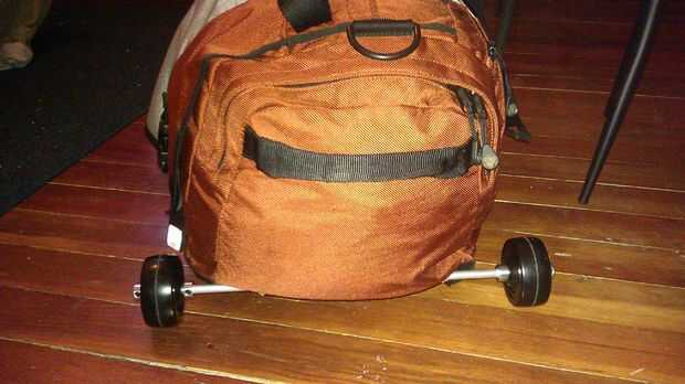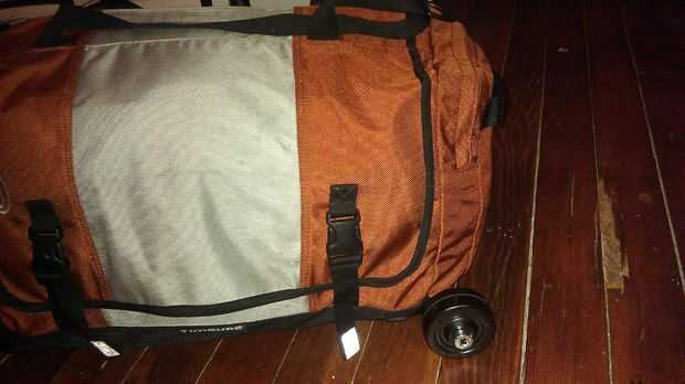 Que rodé este bebé alrededor de OFS y JFK fin de semana pasado y vino para arriba con unos consejos: 1) cosas del bolsillo en el lado de la rueda con algo sólido, como los zapatos. Mi converse se parecía hacer el truco. 2) extender el mango rodando encima de un pañuelo atado en un lazo y luego la colocación a través de la manija del bolso de tela de lana basta. Funcionó muy bien!