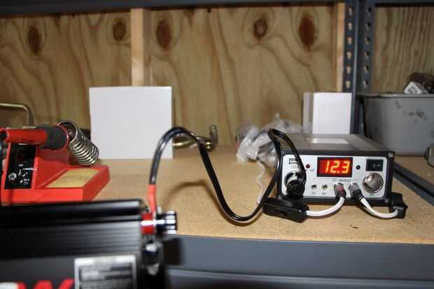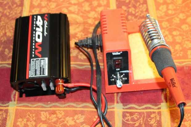 Para conexiones de alambres utilicé un soldador Weller conectado a un inversor que regalaron por Navidad. Luego le enchufamos el inversor de corriente en el controlador de carga solar que ya tenia instalado en mi edificio de almacenamiento de información.
