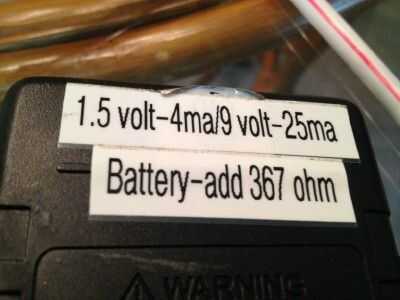 Es fácil olvidar Cuáles son las cifras de retención de trilla para probar baterías. Hice una etiqueta por la parte posterior del medidor. Mis cifras no son muy exactas, pero están cercanas. Es muy posible que considera una batería agotada en una sola aplicación funcionaría aún en menos exigentes aplicaciones. Ver la segunda foto. La batería que leer 3,9 miliamperios en la foto para la introducción con 360 ohmios agregadas Lee 3,8 miliamperios con mi resistencia de ohm 367 añadido al circuito.