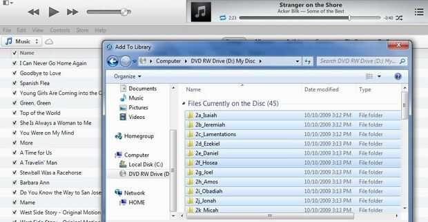 Archivos se deben importar a iTunes. Coloque el CD que contiene los archivos en la unidad de disco del ordenador. Baje el archivo y seleccione Agregar carpetas (o archivos) a la biblioteca. En el cuadro de diálogo Agregar a la biblioteca busque los archivos en el CD. Si desea agregar un número de archivos, clic izquierdo sobre cualquier archivo de una vez. Presionada la tecla Ctrl y presione A. Luego suelte A. Se resaltarán todos los archivos o carpetas en el CD. Haga clic en Seleccionar carpeta (o archivo) en la parte inferior del cuadro de diálogo (no mostrado). Tiempo será necesario para todos los archivos para copiarse desde el disco a la biblioteca de iTunes, así que sea paciente y espere.