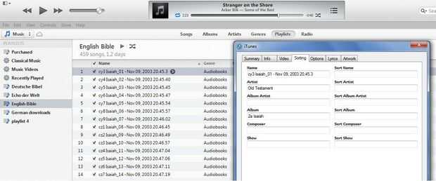 La recién renombrada lista de reproducción aparece en la lista de listas de reproducción a la izquierda de la ventana. Los archivos ("canciones") en la lista de reproducción aparecen en la parte central de la pantalla con el nombre de la lista de reproducción. Haga clic en uno de los archivos y aparece un cuadro de diálogo con numerosas opciones disponibles en iTunes. Izquierda haga clic en obtener información. en ese cuadro de diálogo. Aparece un cuadro de diálogo nuevo con siete fichas. Clasificación permite agregar información extra clase para mantener los archivos en orden, pero cada archivo debe manejarse por separado. Esto es más "para su información" para saber cómo encontrar algunas opciones que no son inmediatamente evidentes en iTunes. La codificación alfa-numérico que utiliza es suficiente para mantener los archivos en su orden correcto. Nota: Si haces clic en el gráfico agrandará y usted puede leer más fácilmente algunos de la letra.