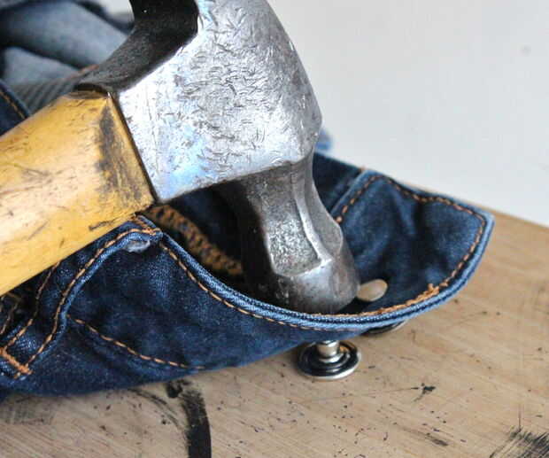 Inserte la parte de atrás del botón en la parte delantera y bajar el martillo en él hasta que se asiente bien. Esto podría tomar unos columpios. El botón de prueba tirando en la parte delantera de la misma - si hay cualquier meneo o un espacio entre el botón y la tela, martillo otra vez.