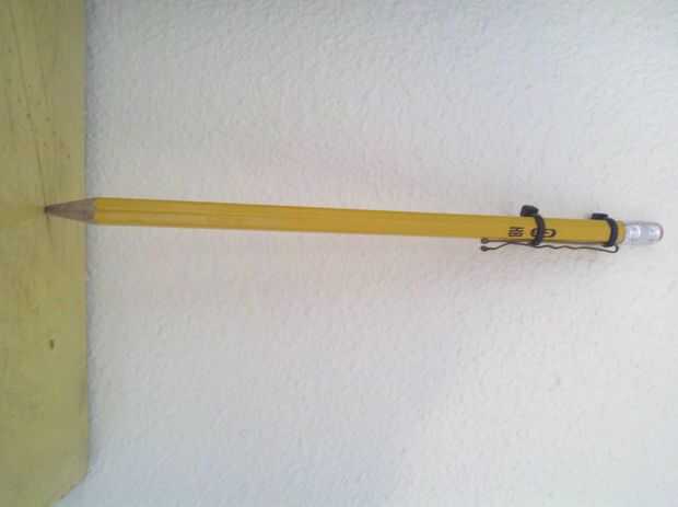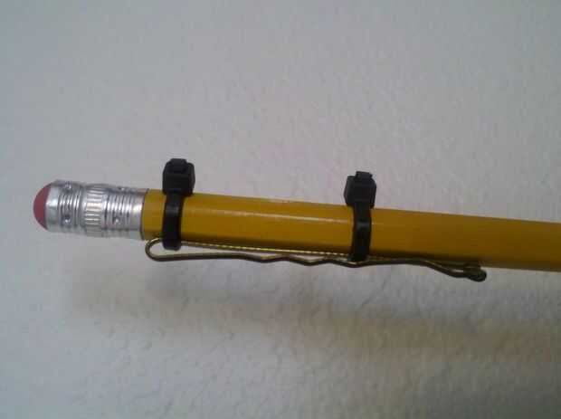 Tomar una amarra y ejecutarlo a través del extremo cerrado de la horquilla, donde hay una gran apertura y apriete en el lápiz con el lado plano de la horquilla hacia abajo. Tire de ella tan estrecha como sea posible.