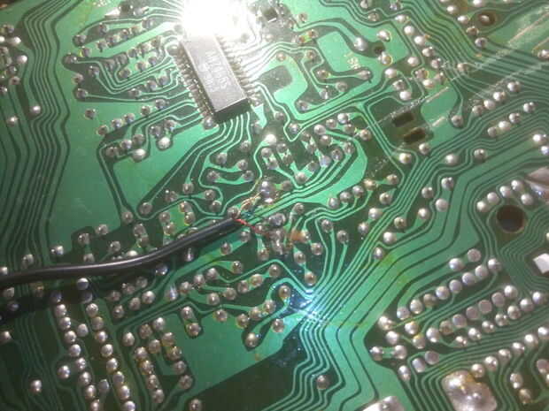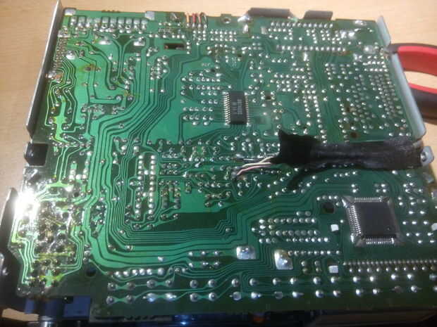 Después de abrir lo que vemos lo que es interesante para nosotros: el cable con 3 cables. Viene de la cabeza de la cinta y va al amplificador. Soldando el cable conector en lugar del cabezal de la cinta se podrá escuchar la música que viene de la toma cuando la radio está en modo cinta (cuando una cinta en el reproductor y no al final).