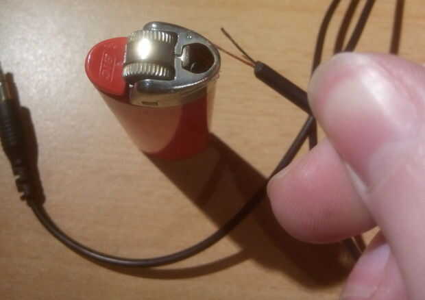Permite probar. Primero prepare el cable de jack (yo tengo la mía de viejos auriculares). Para quitar el aislante (azul y rojo) solo queman con un encendedor.