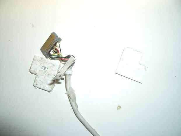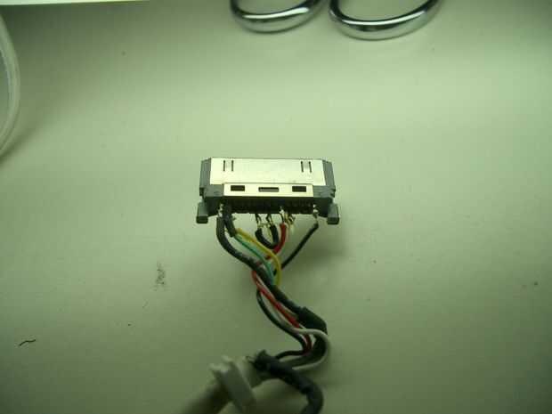 La primera imagen muestra el conector como es viene de Belkin. La tercera imagen muestra el conector como luce después de las modificaciones mencionadas así como implementar el circuito descrito en el paso 4.
