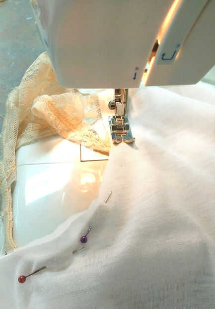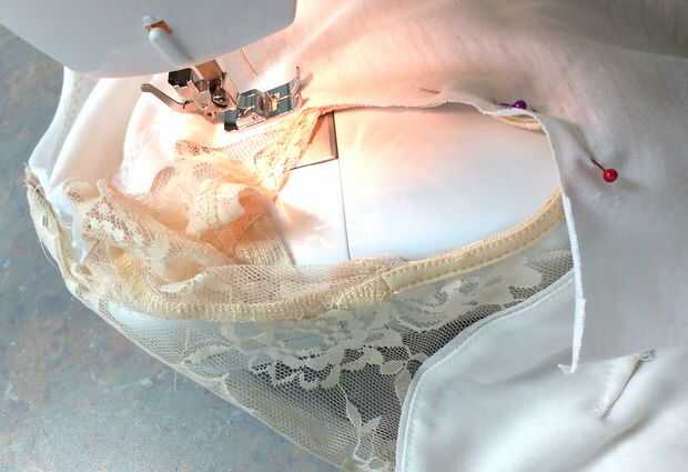 Siga esta misma técnica de costura para fijar el revestimiento en la cintura y en el cuello. Sólo cose hasta llegar a la zona abierta (donde irá el corsé) en cada lado (en la cintura y el cuello). Coser los bordes de la puntilla (donde tomaste la cremallera de) a la guarnición.