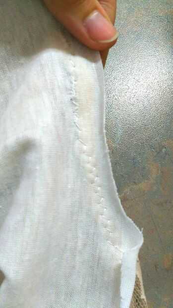 Ahora vas a aplanar el vestido y coser el forro alrededor de las sisas y a cada uno de los lados. Asegúrese de no coser a través de todas las capas (sólo a través de la capa posterior). Utilizar aquí la misma puntada.