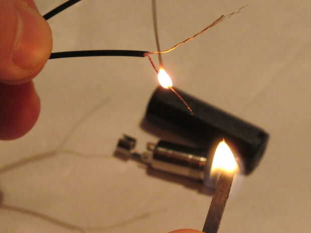 Este paso es importante, que lo serán siendo aislados los cables. El esmalte [o sea] es inflamable por sí solo, así que sólo encendió.