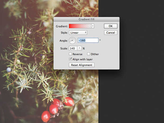 Para hacer un brillo aunque, simplemente crear un degradado en el Panel ajustes y cambiar la configuración para replicar los de arriba. Usted quiere elegir un bonito color rojo, naranja o amarillo brillante para esto. Una vez que la configuración de copiado, haga clic en Aceptar.