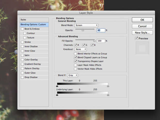 Por último, haga doble clic en el gradiente y cambiar el modo de mezcla a pantalla. Esto le dará ese efecto superpuesto. Luego baje la opacidad a alrededor del 40% y se fijan para ir!