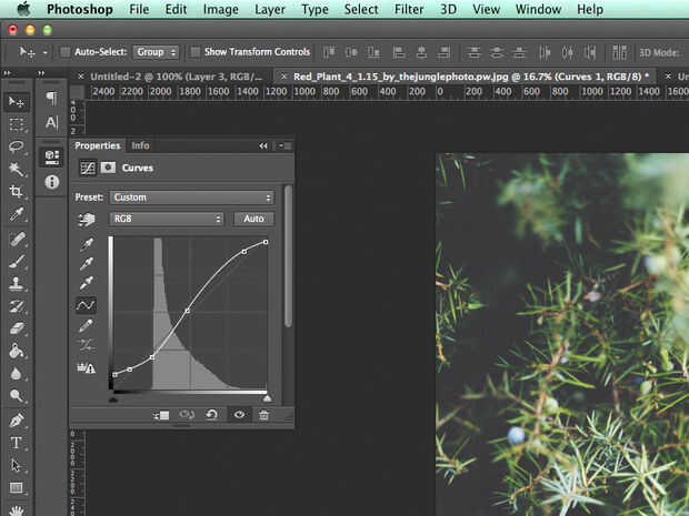 El primer ajuste que vamos a hacer es con la herramienta curvas. Esto se puede acceder haciendo clic en ventana > Ajustes > curvas. Tratar de crear un patrón similar a la curva como se puede ver en la imagen de arriba. Esto aumentar contraste, sacar de las sombras y aclara la imagen.