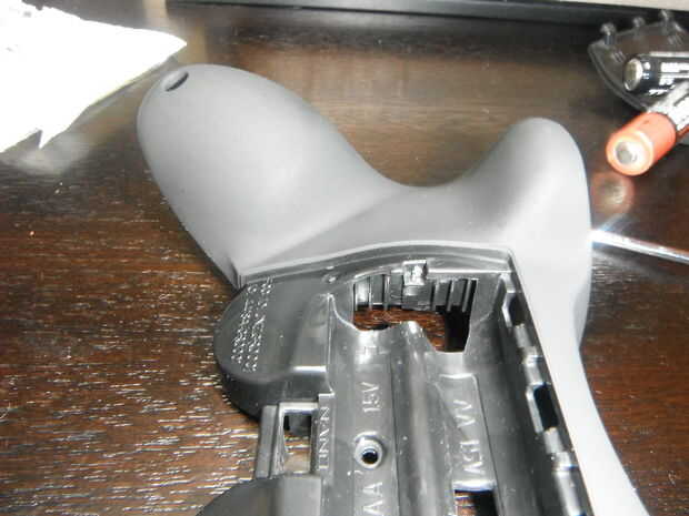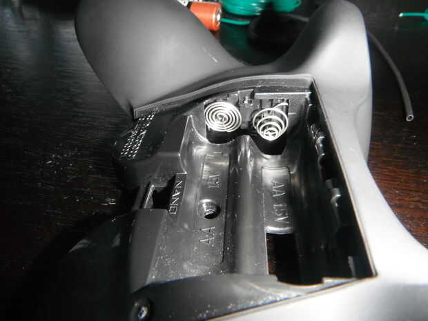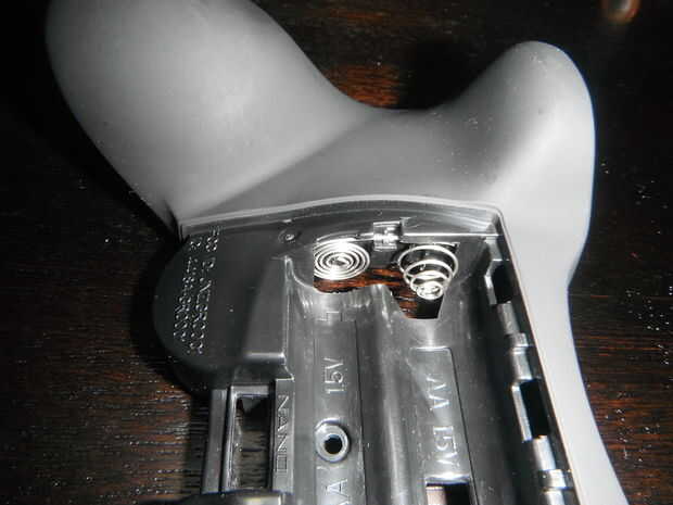 El resorte en espiral sólo conecta las dos baterías. Pop a cabo y corte justo en el medio. Las bobinas de la curva como se muestra y perfore un par de pequeños agujeros en la tapa trasera donde los resortes van sólo un poco más lejos de la esquina que el centro de donde va a ser la bobina. La idea es que el resorte de la bobina ahora tendrá el alambre apretado en la esquina (originalmente ambas bobinas compatibles entre sí). Si no entiendes bien la primera vez, no es gran cosa. Solo juega con ella hasta llegar ambas bobinas para permanecer en posición firmemente por sí mismos. No quiero tener que jugar con ellos cada vez que cambie las baterías.