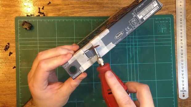 Utilizando mi herramienta rotatoria y un disco de corte, hice el corte del interruptor. Me quitan la broca de acero de la carcasa exterior con unos alicates y un destornillador. Luego lijar el corte con una piedra abrasiva y algunos archivos de mano.
