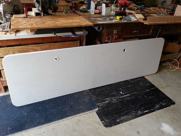 Quería una tapa de formica blanco liso, pero yo quería usar un vs base madera maciza una base de tablero de partículas y he encontrado una mesa de formica blanco superior en la restauración que pude cortar y usar para la sierra caladora.