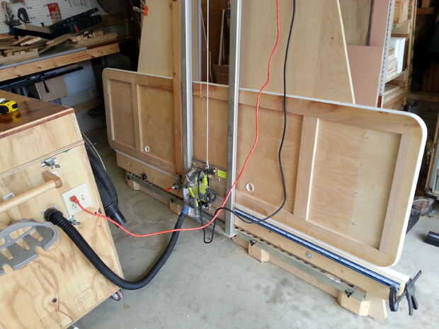 También se corta y redondeada la parte superior de formica (usando la mesa de fresadora!) y luego a la base con una bisagra a la tapa de formica, con una 1/8" pedazo de madera debajo de la bisagra para levantar la parte superior por lo que sería la parte superior de la tabla VI (alternaba los tornillos de la parte inferior y superior). La mesa fue levemente inferior a la Sierra de mesa superior por lo que acaba de dejar como está (ver la tabla de router Instructable sobre qué hacer si la mesa es demasiado alta).