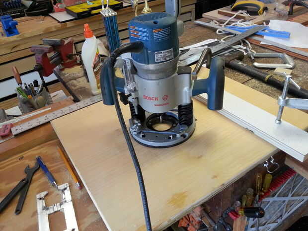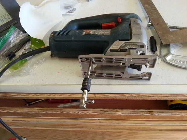 Encuentra la Sierra de vaivén en la parte de arriba y utiliza un enrutador de inmersión (prestado el router de mi mesa de router) a una profundidad de 1/4" de apertura de la ruta dar cabida a la Sierra de vaivén.