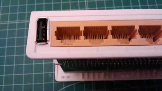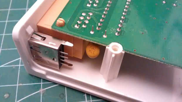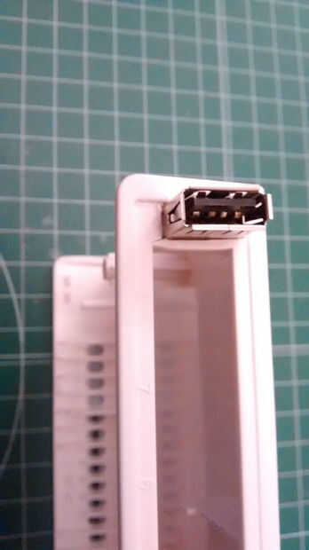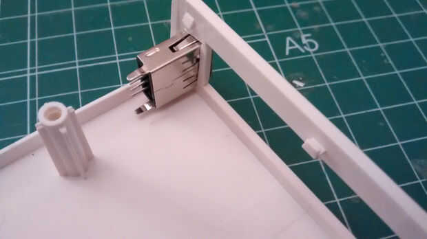 Lo primero que necesitamos es un destornillador para abrirla. Agregare el puerto USB en la parte posterior, junto con los conectores RJ-45. Elegir un USB blindado entrada-salida tipo receptáculo que tengo en casa de Molex (número de parte: 105057-0001). Después de quitar la electrónica de la caja, puse el conector en la posición, marcar la zona y cortar con un cortador. Parece que ajusta muy bien, así la última vuelve a montar el tablero para asegurarse de que el USB conector no golpearlo.