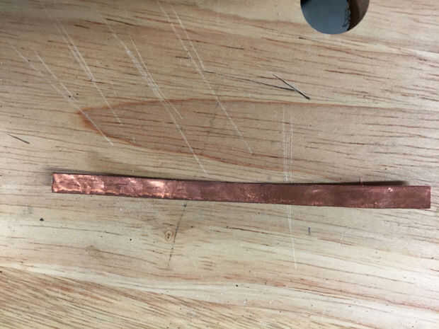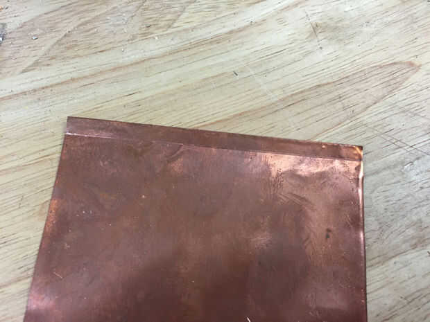He encontrado de experiencias pasadas que cobre, cortar con tijeras es una receta para el desastre. Cada vez que lo he probado he terminé con una franja más ancha en un extremo y con una curva pronunciada, también. Por lo tanto, para evitar esto, sujeta mi regla de metal en la línea de medición y anotó el cobre con un cuchillo de la manía (que prácticamente destruyó la hoja, pero la vida hizo más fácil). Una vez que había anotado el cobre podía doblar hacia atrás y adelante para completar el corte.