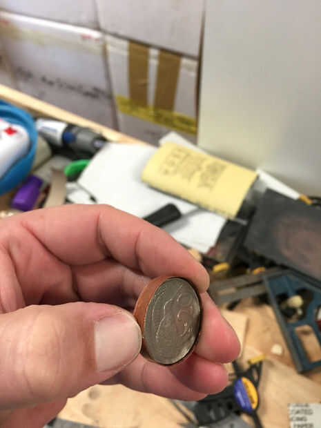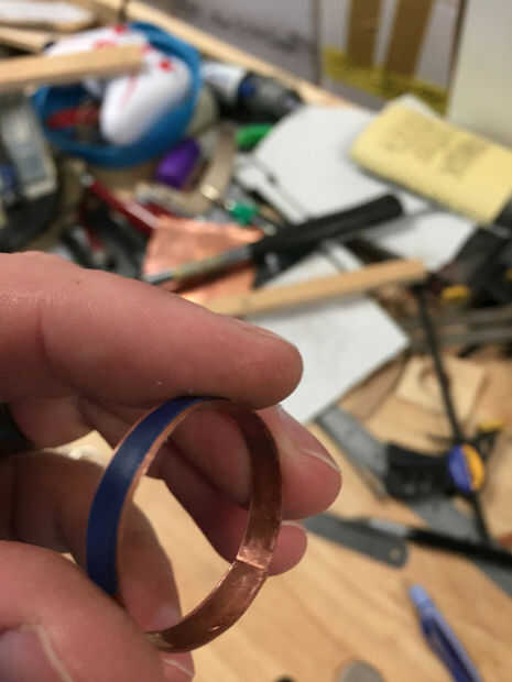 Para obtener la franja en forma de anillo doblado alrededor de la cabeza de mi martillo. Esto fue mucho menor que el diámetro que necesitaba, pero he encontrado que el cobre terminó muy cerca del diámetro correcto. Hice la formación final alrededor de una moneda que sucedió coincidentemente ser exactamente del diámetro adecuado.