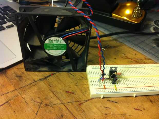 La plata raya del diodo debe ser del lado conectado al cable de + 12v y plomo positivo del ventilador. La otra pata se conecta al cable negativo de ventilador.