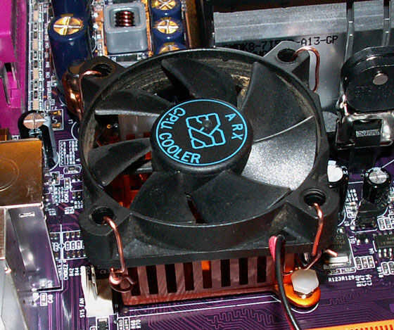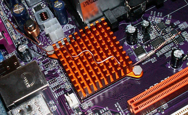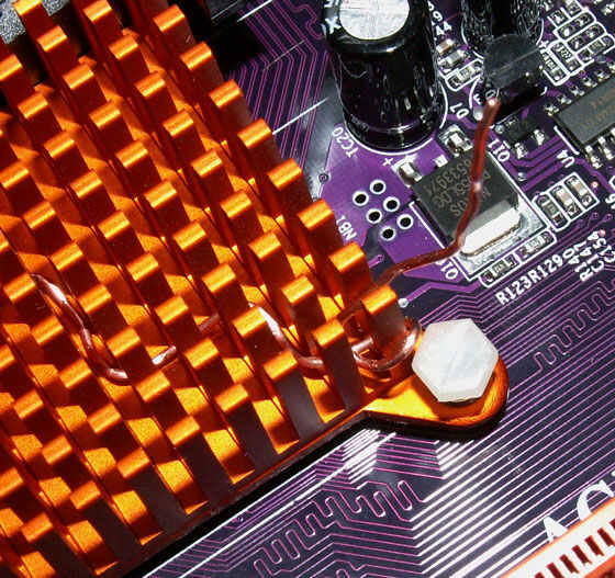 Pues bien, ese ventilador es más grande que el disipador de calor. No hay problema - usaremos el alambre de cobre para suspender el ventilador encima del disipador de calor. Cortar los pies de alambre en dos tiras de 6" y tira la capa plástica (si existe). Ahora la serpiente el cable entre las aletas del disipador de calor, estiramiento de esquina a esquina. Empuje el cable hacia abajo con el destornillador mini. Luego enrollar los extremos alrededor de las aletas de la esquina y baje demasiado. Dejar los extremos que del disipador de calor.
