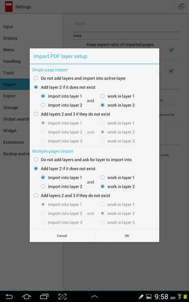 Para importar el PDF en capa 1 y automáticamente agregar una capa de anotación y arañazos seleccionamos estas opciones: