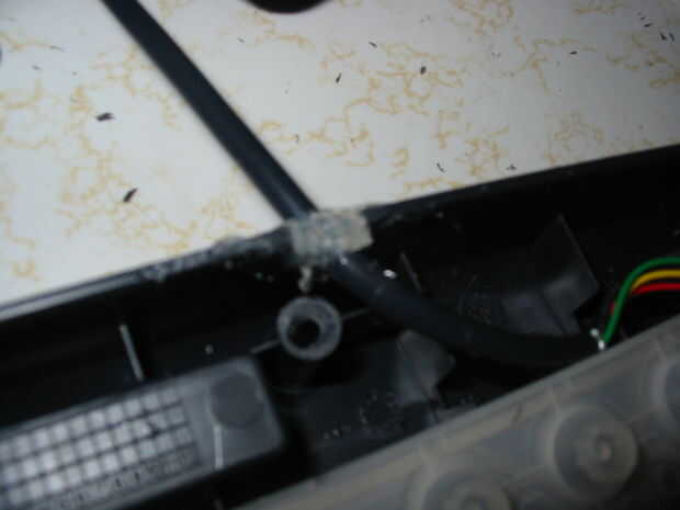 Si el cable de datos es en la forma de los dedos (como en teclados antiguos de dell) tienes que moverlo. Personalmente elegí venir directamente hacia afuera de la media, pero podrían hacerlo se parecen más a una guitarra de verdad y lo que sale de la derecha. Una vez más, simplemente recortar un agujero, y pegamento caliente lo que tiene que ir en él.