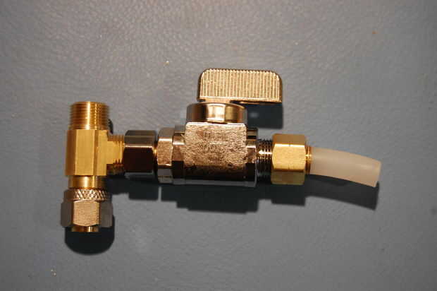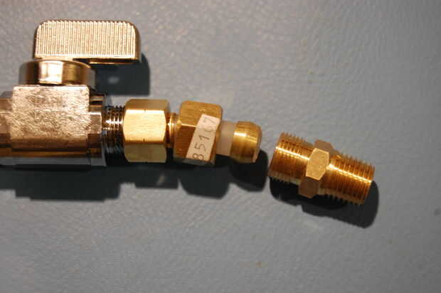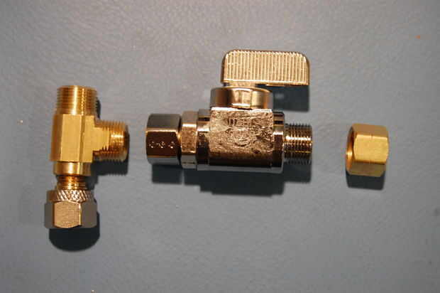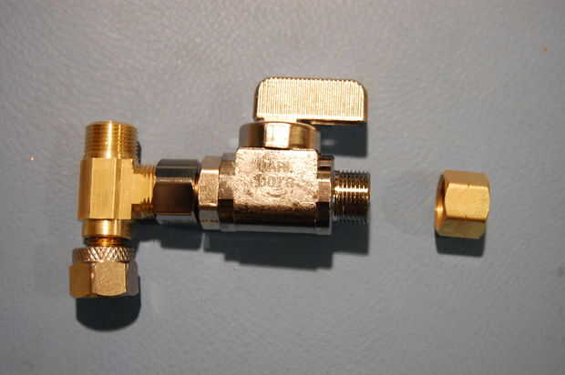 Las primeras pocas piezas se pueden poner juntos "en el Banco." Tomar al cruce en T y retire la tuerca de los extremos cortos y largos. Colóquelos a un lado para más tarde. Accesorios de compresión no necesitan cinta para cañerías, entonces atornille la válvula directamente sobre el extremo corto del cruce. Apriete con una llave. Asegúrese de que la palanca de la válvula es hacia arriba, como se muestra.