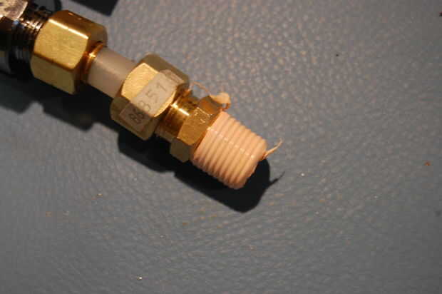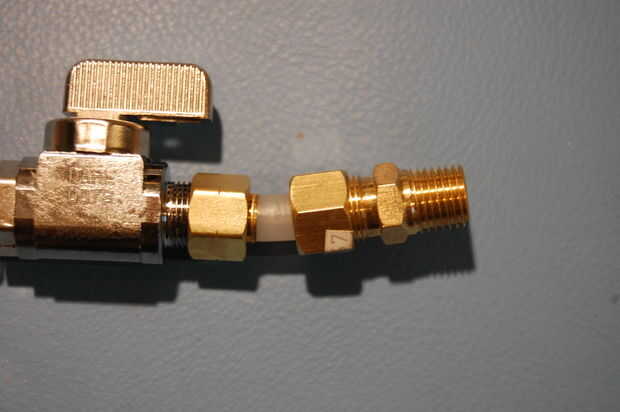 Retire la tuerca de la compresión a 1/4" adaptador y deslícelo sobre el extremo libre del tubo. Apriete la tuerca en el adaptador. Puede que necesite usar dos llaves, dado vuelta en direcciones opuestas, apretar bien la tuerca.