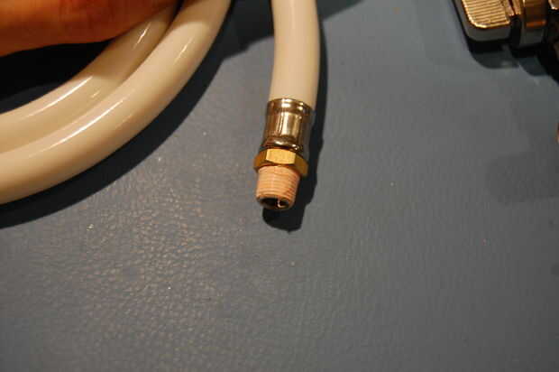 Ahora es tiempo de utilizar cinta de plomero. Envolver unas capas en el extremo libre del adaptador y enroscar la manguera del rociador de cocina. Mi manguera en realidad tenía otro adaptador - sellar a esta Unión con cinta de plomero, si existe.