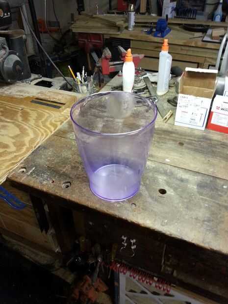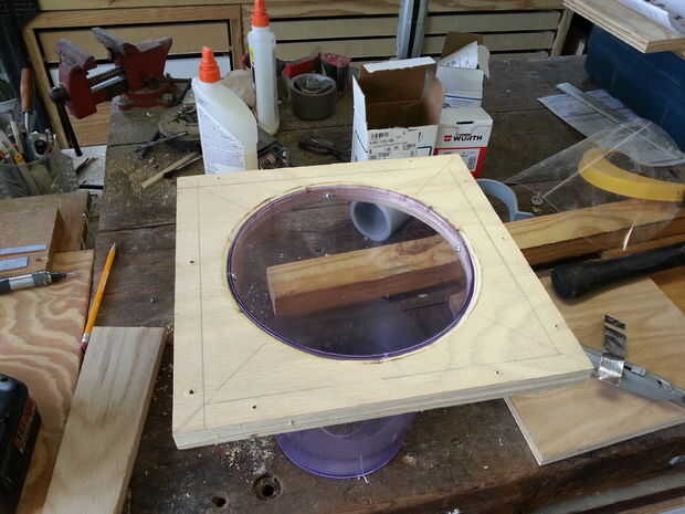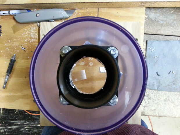 Encontré un cono plástico redondo grande en forma de recipiente en el fondo de comercio y corte un orificio en la parte inferior de la caja para montarlo. También cortar un agujero en la parte inferior del contenedor plástico y agregar un adaptador de aspiradora de taller y había adornado incluso con la base de la canastilla de plástico. Después sellé todas las aberturas con cinta adhesiva metálica.