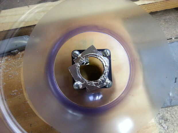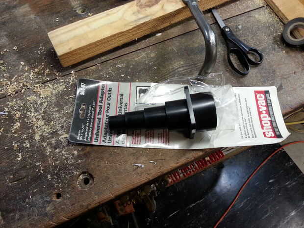 Poner un trozo de madera sobre el agujero original Shop Vac, pero deja una pequeña abertura para el aire split con el aire que baja por el agujero de la mesa de router.