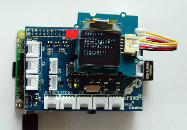 Primero montar el GrovePi en la Raspberry Pi. Luego tomar la OLED de Grove y conectar cualquiera de los cuatro puertos I2C de la GrovePi. Ahora encienda el Raspberry Pi.
