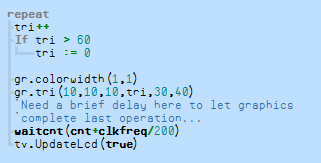 Estamos haciendo una pequeña animación simple incrementando la variable tri . Una vez que se pone por encima de 60, lo restablece a 0 para mantener el triángulo de animación en la pantalla. Establecemos el color y el ancho de la línea que vamos a dibujar con gr.colorwidth(1,1) . El primer argumento define el color, la segunda establece el ancho.