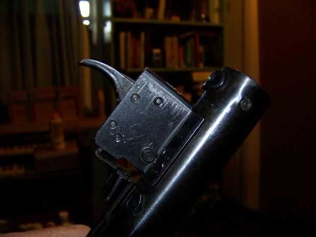 Levantar la acción de la acción, note que los pernos mantiene el mecanismo del gatillo juntos son libres flotante caerse, envolver un trozo de papel en el mecanismo de disparo y seguro con bandas de goma.