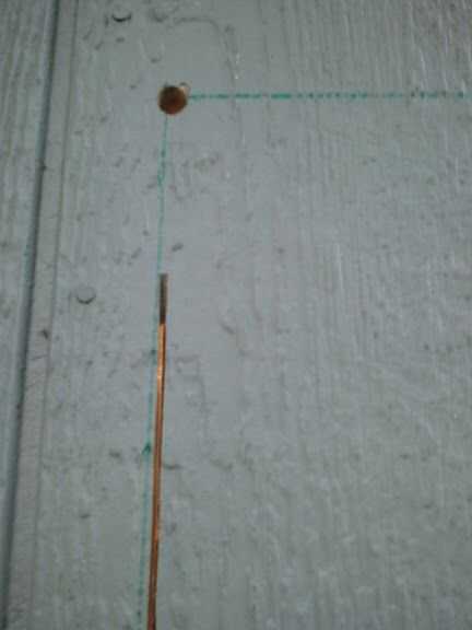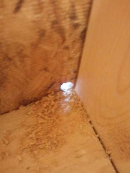 Cada una de las cuatro esquinas, taladro una 1/2"(1 cm) a través hacia el exterior. Estos solo Marque las esquinas para que puedo encontrar en el exterior. El material en el exterior de mi caseta es 1/2" OSB revestimiento, que causó un montón de chipout cuando presioné el taladro a través. Yo debo haber sido más cuidadoso, pero va a ser cubierto.