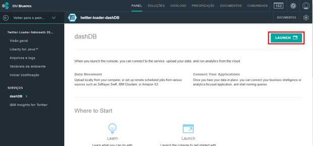 Para ver las tablas, tendrá que acceder a la base de datos. Ir a la página del proyecto de la aplicación y haga clic en el botón de servicio dashDB. Esto te redirigirá a la página del servicio. Haga clic en el botón de "Lanzamiento" para acceder a la base de datos.