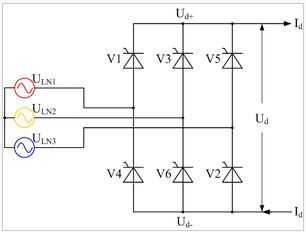 Las fuentes de tres tensión reciben puente rectificador de seis pulsos. La CA se convierte en señal de DC por el rectificador. En el lado de salida del RL se conecta carga. Los armónicos producidos por el rectificador debe ser evaluada.