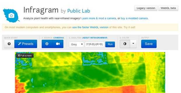 Procesamiento posterior: Una vez que usted toma una fotografía multiespectral con una cámara modificada, después debe procesar, composición de los datos para generar una nueva imagen que (si funciona) muestra áreas saludables, radiación fotosintéticamente activas como brillantes regiones infrarrojos y visibles.
