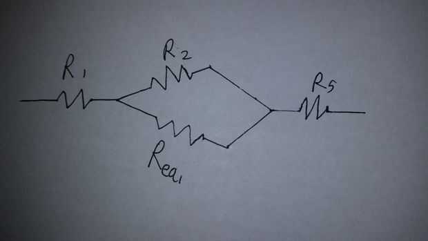 Resistencias R3 y R4, ahora se han reducido para formar el resistor equivalente Req1. Observe cómo esta nueva resistencia está en paralelo con el resistor R2. Estas resistencias también pueden reducirse a un solo componente.